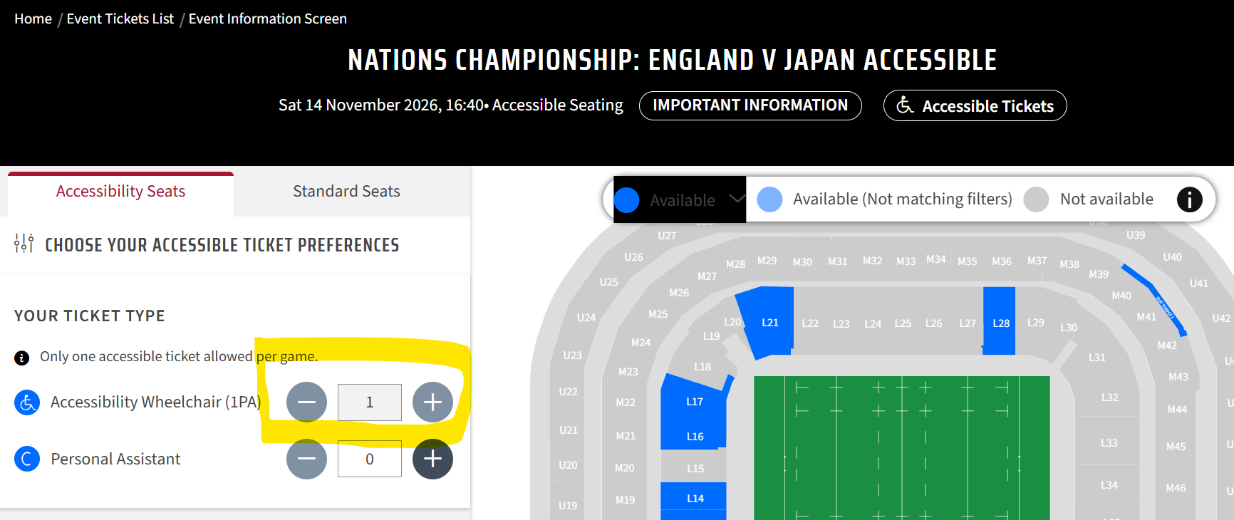 Now you should be able to see availability suitable for your accessibility requirements. On the top menu bar you will see Event Tickets, so click on that for a list of all matches we are selling tickets for. You can then select the match you wish to get tickets for (subject to availability & eligibility) and click on the Accessible Tickets button.