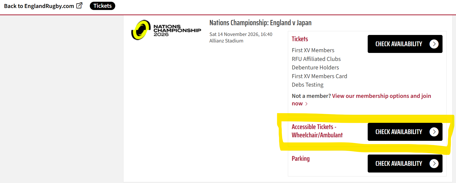 If you have held all the match tickets you want, you can click on the Shopping Basket icon to proceed to checkout OR click on Events List to go to the match and add the Accessible Parking.